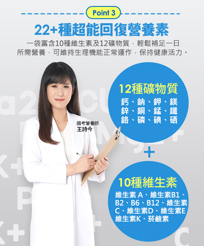 22+超能回復營養素,12 種礦物質+10 種維生素