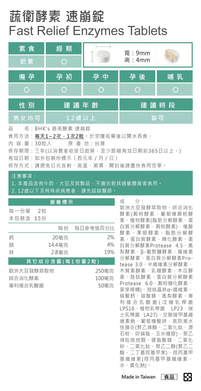 | 內容物 (完整成份/食品添加物) | 歐洲大豆發酵萃取物、綜合消化酵素(澱粉酵素、葡萄糖澱粉酵素、植物酵素(脂肪分解酵素、蛋白質分解酵素、澱粉酵素)、植酸酵素、果膠酵素、脂肪分解酵素、蛋白質酵素、轉化酵素、蛋白質分解酵素Protease 4.5、鳳梨酵素、β-葡聚醣酵素、纖維素分解酵素、蛋白質分解酵素Protease 3.0、半纖維素分解酵素、木質素酵素、乳糖酵素、木瓜酵素、胜肽酵素、蛋白質分解酵素Protease 6.0、澱粉糖化酵素、麥芽糊精)、微結晶狀α-纖維素、碳酸鈣、碳酸鎂、鳳梨酵素、專利複合乳酸菌(戊糖乳桿菌 LPS16、植物乳桿菌 LP23、瑞士乳桿菌 LA27)、交聯羧甲基纖維素鈉、葡萄糖酸鋅、高防潮水性膜衣(聚乙烯醇、二氧化鈦、滑石粉、卵磷脂、玉米糖膠)、聚乙烯吡咯烷酮、硬脂酸鎂、二氧化矽、二氧化鈦、聚乙二醇(聚乙二醇、二丁基羥基甲苯)、羥丙基甲基纖維素(羥丙基甲基纖維素、水、氯化鈉)。 |
