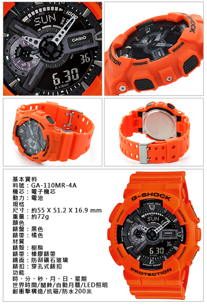 秋冬亮眼橘X酷黑新色登場,以空軍飛行外套的橘色內襯為設計概念,黑色錶盤點綴象徵軍事榮耀的金色星星,搭配黑色反轉液晶顯示設計,展現帥勁軍事魅力!具備耐衝擊構造、防水200米、世界時間、計時碼錶、倒數計時等多項功能。