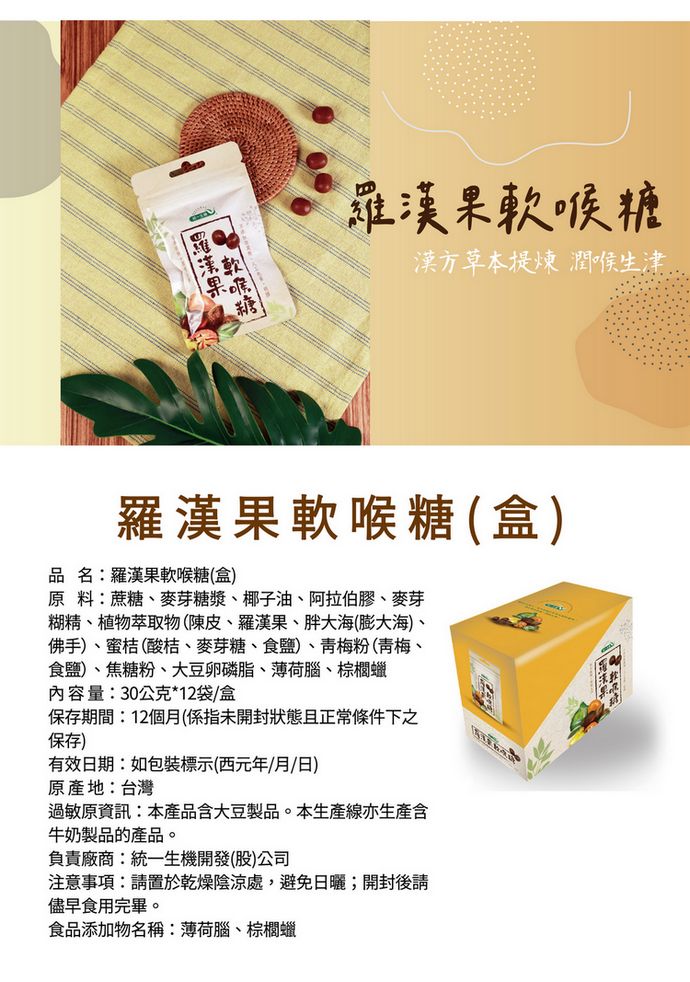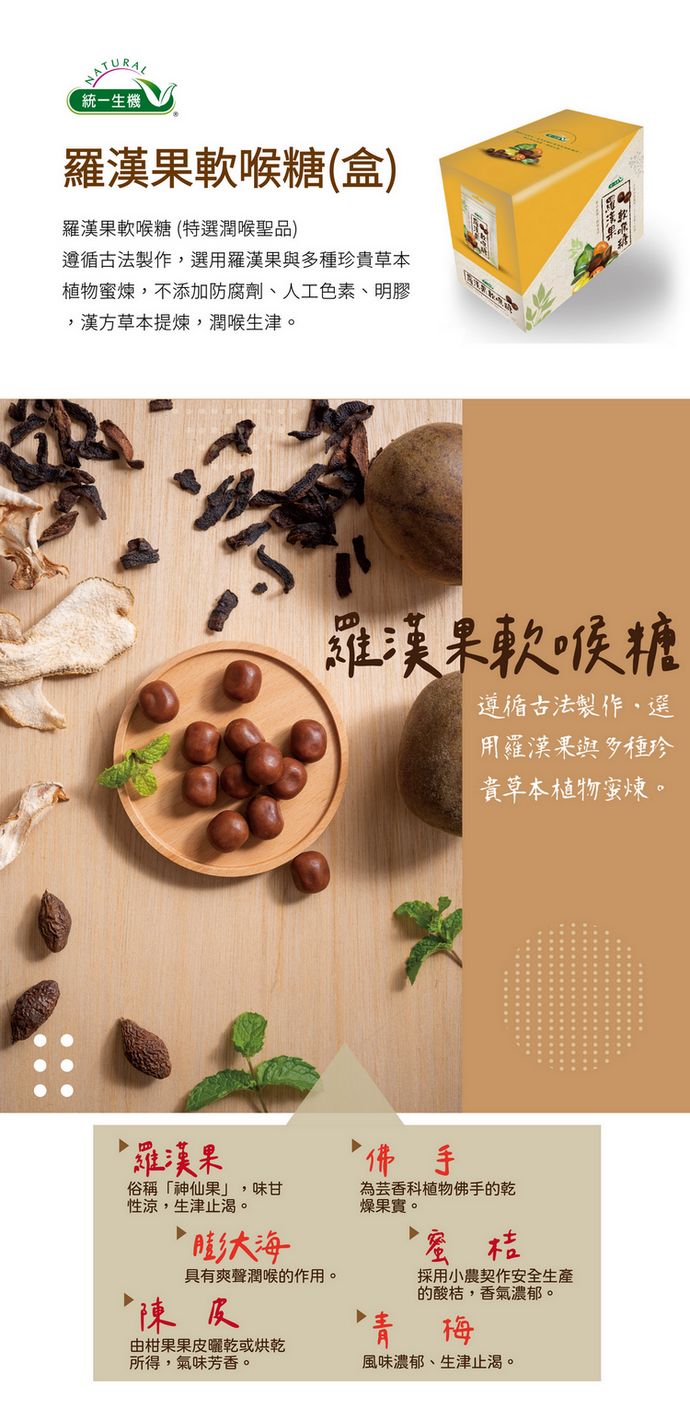 統一生機羅漢果軟喉糖(30g*12袋/盒)