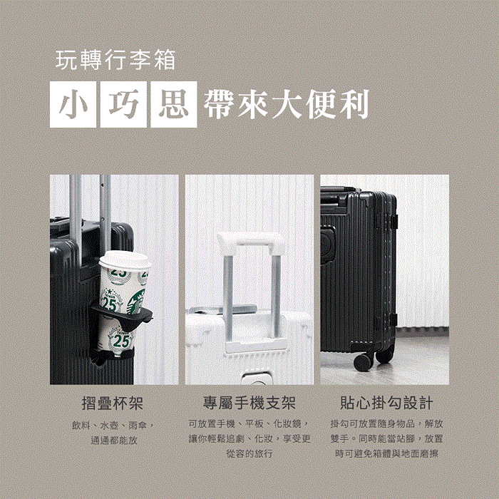 ✦專屬手機支架: 拉桿上方,旅途中看劇、化妝更方便。