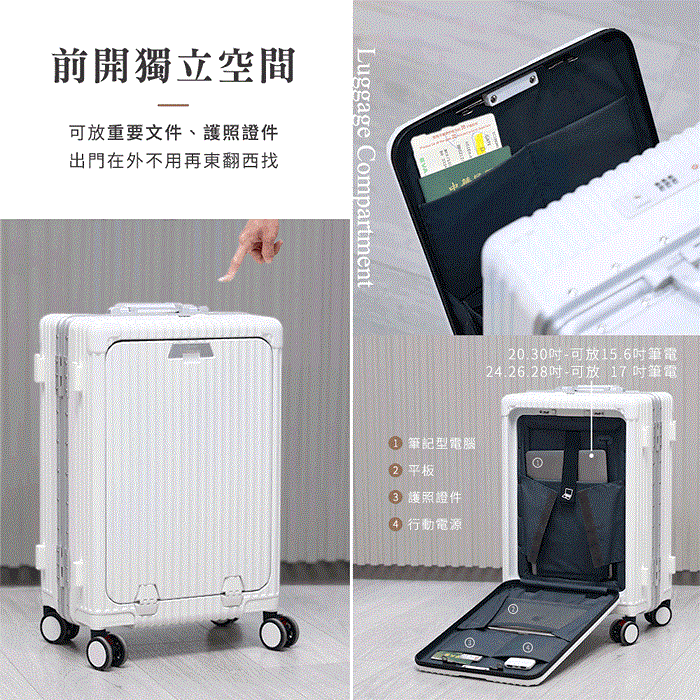鋁合金邊框,相較拉鍊行李箱更加防水耐摔耐撞