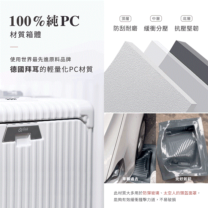 | 成分 | 箱面材質:德國拜耳100%純PC 箱內材質:滌綸 |