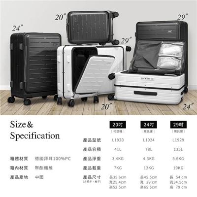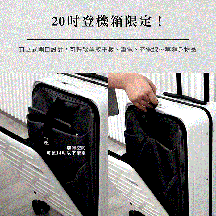 ●20吋登機箱限定直立式開口設計,可輕鬆拿取平板、筆電、充電線...等隨身物品