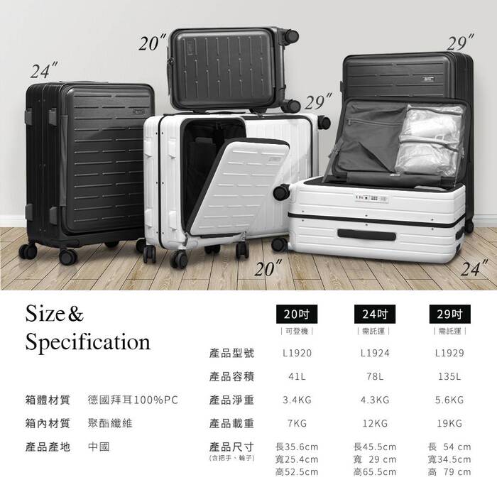 | 注意事項 | ●商品出廠時,輪子皆通過滑順測試,收到商品時有些許粉塵均屬正常現象,並非舊品! ●此款行李箱為固定式密碼鎖,請自行設定自己專屬的密碼。 ●保固期限&範圍:保固3年(購買日算起3年內,可維修之零組件,包含輪子、拉桿、密碼鎖、提把等消耗品,完全不收取維修費及零件費)。 ●購買起一年內破箱,並附上航空公司開立的「行李破箱證明」,即可免費換新箱,但需自備紙箱並負擔來回運費。※更換的行李箱依現有庫內款式為主,無法指定。 ●自購買日算起一個月內免收來回運費,一個月後須自行負擔來回運費(約新台幣300元)。 ●商品顏色會因螢幕設定而略有不同,顏色以實際商品為主 ●商品尺寸會因測量起點與終點有所誤差(誤差值約3公分以內),實際尺寸以實際商品為主。 ●商品於鑑賞期內辦理退、換貨,商品必須是〝無落地使用、無使用過〞完整全新狀態,並請務必妥善密封包裝。 |