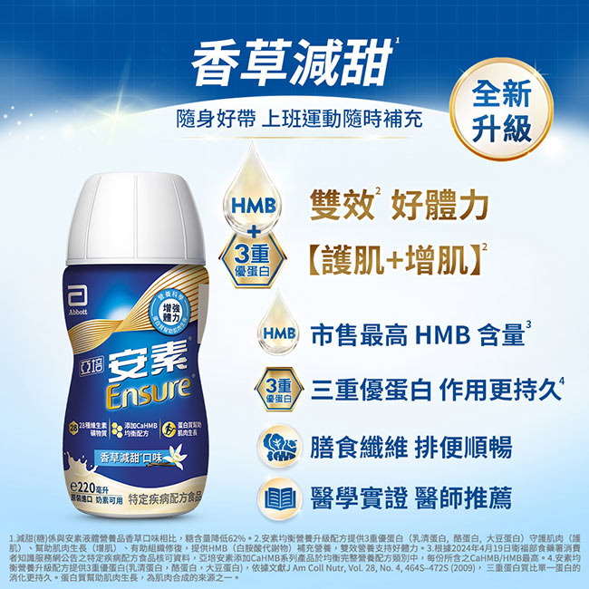 | 包裝內容/商品規格 | [買1箱送2罐]亞培 安素香草減甜即飲 HMB升級配方(220ml)x24入+(贈品)亞培 安素香草減甜即飲 HMB升級配方(220ml)x2 |
