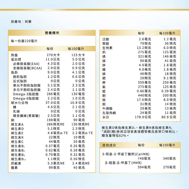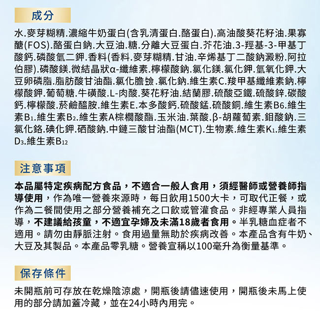 | 內容物(完整成份/食品添加物) | 水.麥芽糊精.酪蛋白鈉.濃縮牛奶蛋白(含乳清蛋白、酪蛋白).糖.菜籽油.果寡醣(FOS).玉米油.檸檬酸鉀.分離大豆蛋白.3-羥基-3-甲基丁酸鈣.磷酸鎂.香料(香料、辛烯基丁二酸鈉澱粉、麥芽糊精、磷酸鈣、糖).卵磷脂.磷酸氫二鉀.微結晶狀α-纖維素.氯化鉀.磷酸氫二鈉.氯化膽生僉.維生素C.磷酸鈣.葡萄糖.氯化鈉.氫氧化鉀.羧甲基纖維素鈉.L-肉酸.牛磺酸.維生素E.鹿角菜膠.椰子油.硫酸亞鐵.硫酸鋅.菸鹼醯胺.硫酸錳.本多酸鈣.硫酸銅.食用紅色七號.維生素B1.維生素B6.維生素B2.維生素A棕櫚酸酯.葉酸.三氯化鉻.β-胡蘿蔔素.鉬酸鈉.碘化鉀.維生素K1.硒酸鈉.生物素.維生素D3.維生素B12 |