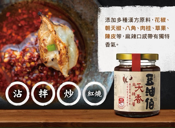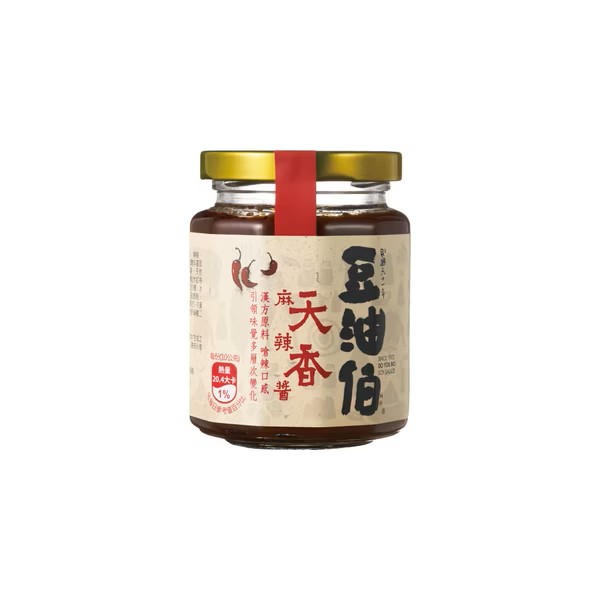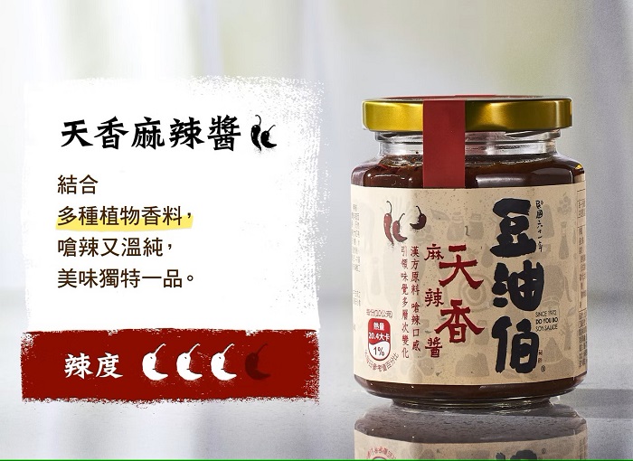 豆油伯天香麻辣醬 營養標示:每份(10公克)營養成份:(本包裝含26份) 熱量20.4大卡、蛋白質0.8公克、脂肪1.2公克、飽和脂肪0.2公克、反式脂肪0公克、碳水化合物1.9公克、糖1.1公克、膳食纖維0.6公克、鈉367毫克 豆油伯豉留香 營養標示:每份(10公克)營養成份:(本包裝含26份) 熱量19大卡、蛋白質0.6公克、脂肪1.0公克、飽和脂肪0.1公克、反式脂肪0公克、碳水化合物2.0公克、糖1.8公克、膳食纖維0.3公克、鈉282毫克