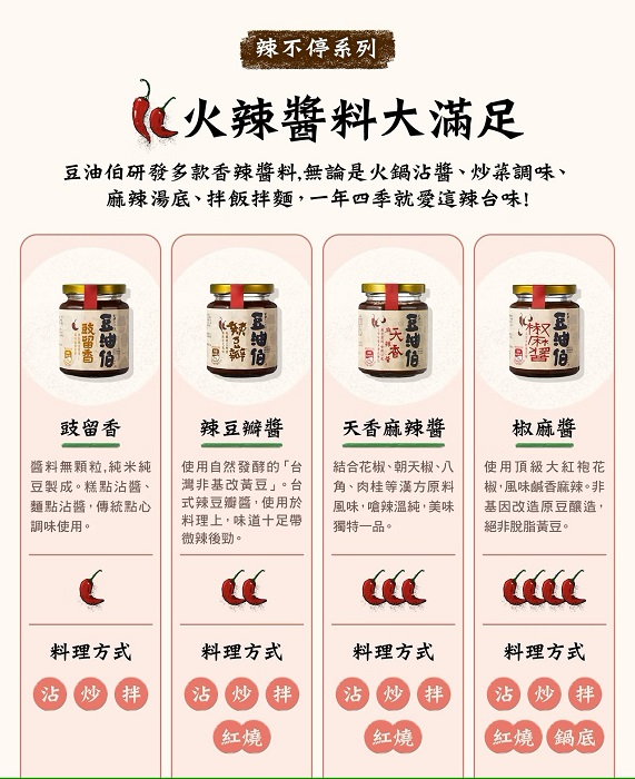 | 包裝內容/商品規格 | 豉留香260g×1+麻辣醬260g×1 (共4組) |