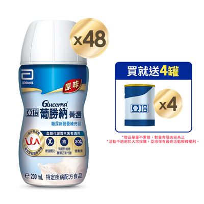 | 包裝內容/商品規格 | [買2箱送4罐]亞培 葡勝納原味加纖維糖尿病專用營養品(200ml)x48入+(贈品)亞培 葡勝納SR原味+纖維糖尿病營養品(200ml) x 4罐 |