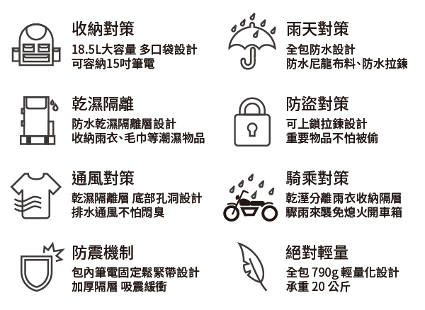 | 注意事項 | ※ 筆電收納層可容納15"筆電;實測機身尺寸:35.7x23.8x1.8 cm。 ※ 產品示意圖僅供參考,本賣場不包含主商品以外(如:拉鍊上鎖鎖頭、外掛小包配件、手機、票卡...等)之示意配件。 ※ 本賣場產品圖片,可能會因為拍攝角度、環境、螢幕設定、燈光明暗等因素,而產生色差,故請以實際收到貨品為準。 ※ 產品規格之尺寸、重量,皆為人工測量,測量可能會有些許差距(尺寸誤差±2cm/重量誤差±10%g內皆屬正常範圍)原廠保留產品規格修改權利,數據請以原廠資料為準。 |