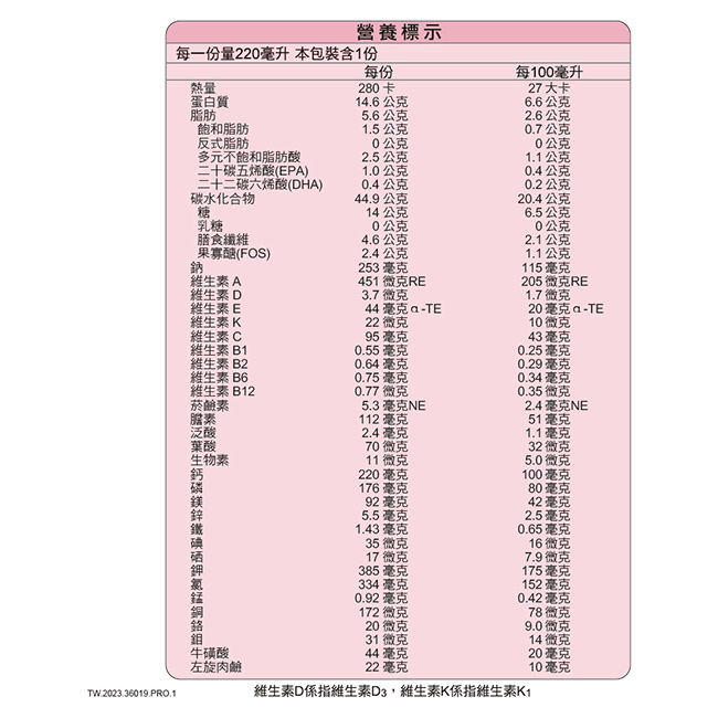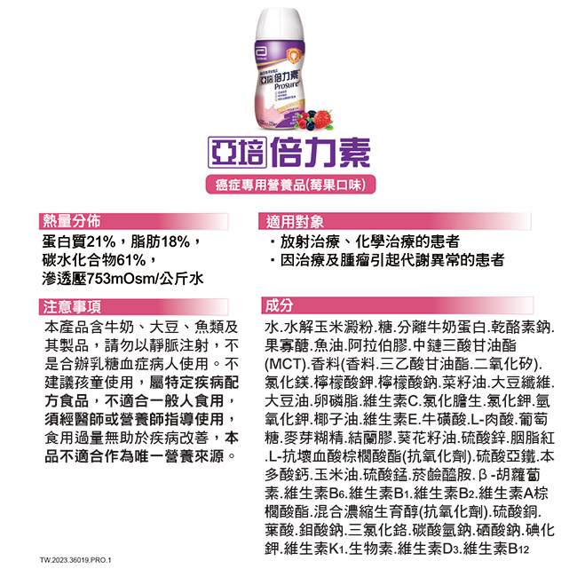 | 注意事項 | 本產品含牛奶、大豆、魚類及其製品,請勿由靜脈注射,不適合半乳糖血症患者使用.不建議孩童使用,屬特定疾病配方食品,不適合一般人食用,須經醫師或營養師指導使用,食用過量無助於疾病改善,本品不適合作為唯一營養來源。 |
