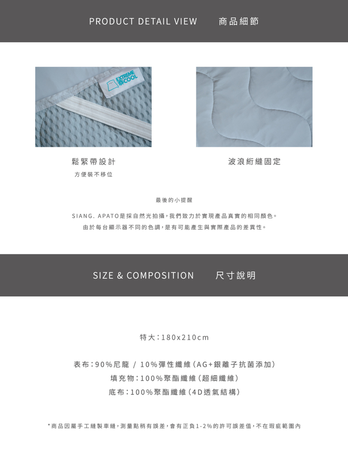 | 成分 | ◆表布: 90% Nylon + 10% Spandex(Ag+銀離子抗菌添加) ◆填充: 100% Polyester ◆底布: 100% Polyester ( 4D透氣結構 ) |