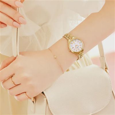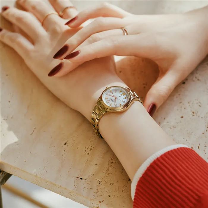 搭配與膚色相襯的Lady Gold金色錶殼和錶帶,呈現出成熟優雅的氛圍