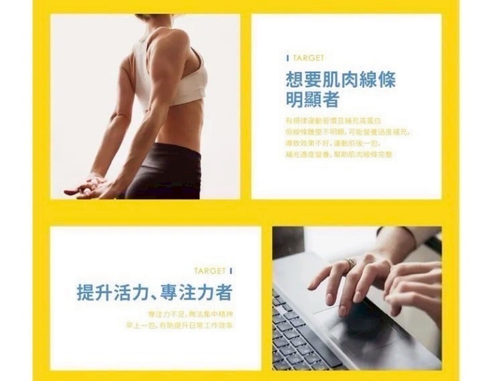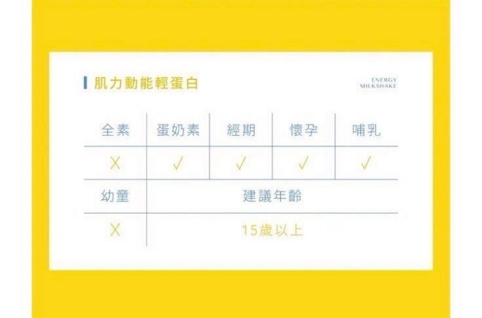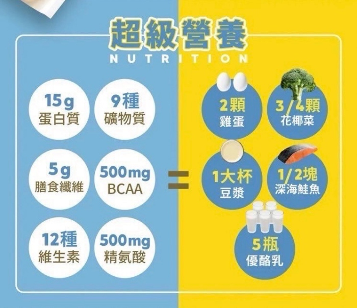 | 內容物 (完整成份/食品添加物) | 麥芽糊精、大豆蛋白、異麥芽寡醣、奶精粉【葡萄糖漿、全氫化棕櫚仁油、酪蛋白酸鈉、磷酸氫二鉀、脂肪酸甘油酯、二氧化矽、香料】、難消化麥芽糊精、豌豆蛋白、支鏈胺基酸(L-白胺酸、L-異白胺酸、L-α胺基異戊酸、葵花卵磷脂)、精胺酸、綜合果汁粉【砂糖、麥芽糊精、綜合水果濃縮汁(鳳梨、蘋果、橘子、百香果、蜜柑、芒果、木瓜、香蕉、萊姆、檸檬、白葡萄、藍莓、西印度櫻桃、紅葡萄、水蜜桃)、檸檬酸、檸檬酸鈉、香料、蘋果酸、β-胡蘿蔔素】、二氧化矽、綜合維生素【乳糖、麥芽糊精、L-抗壞血酸(維生素 C)、維生素 E (乙酸 dl-α-生育醇酯、乾燥葡萄糖漿、辛烯基丁二酸鈉澱粉、二氧化矽)、鹽酸吡哆辛(維生素 B6)、核黃素(維生素 B2)、菸鹼醯胺、硝酸硫胺明(維生素 B1,硝酸噻胺)、乾燥維生素A 醋酸鹽 (乾燥葡萄糖漿、阿拉伯膠、玉米澱粉、維生素 A 醋酸鹽、生育醇(維生素 E)(抗氧化劑))、本多酸鈣、維生素 D3(辛烯基丁二酸鈉澱粉、蔗糖、抗壞血酸鈉(抗氧化劑)、中鏈三酸甘油酯、二氧化矽、維生素 E(抗氧化劑)、維生素 D3)、維生素 B12 (麥芽糊精、檸檬酸鈉、檸檬酸、維生素B12)、葉酸、生物素】、香料、黑馬卡粉、西伯利亞人參萃取物、紅景天萃取物、植物乳酸桿菌(麥芽糊精、植物乳酸桿菌)、蔗糖素(甜味劑)、綜合礦物質【碳酸鈣、麥芽糊精、氧化鎂、葡萄糖酸鋅、焦磷酸鐵、硒酵母、鉻酵母(非活性酵母、三氯化鉻)】、肌酸 |