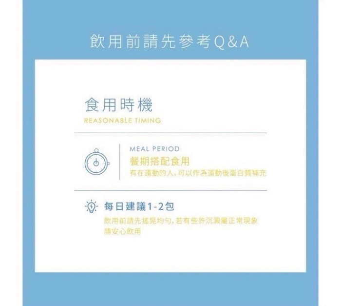 | 注意事項 | ◎開封後請立即飲用完畢 ◎本產品含有奶類、豆類及其製品,不適合對其過敏體質者飲用 ◎奶蛋素可食用,全素不行 ◎孕婦、哺乳期婦女、有特殊體質者,建議使用前先諮詢醫師專業評估 ◎請放置兒童不易取得之處 |