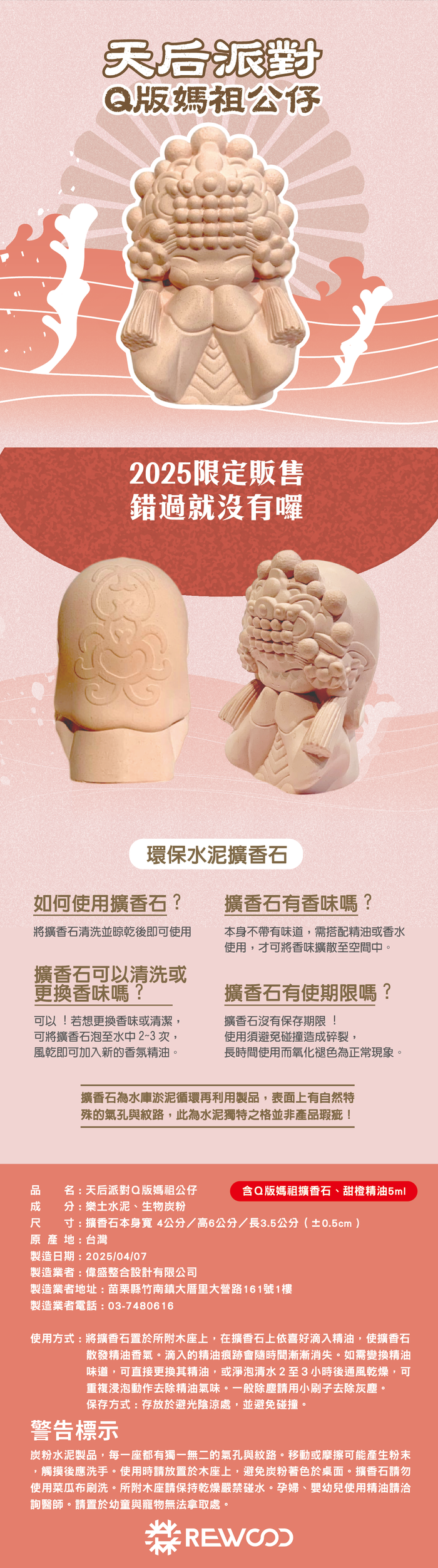 | 內容物 | Q版媽祖公仔擴香石1隻+甜橙精油5ml+原木杯墊 |