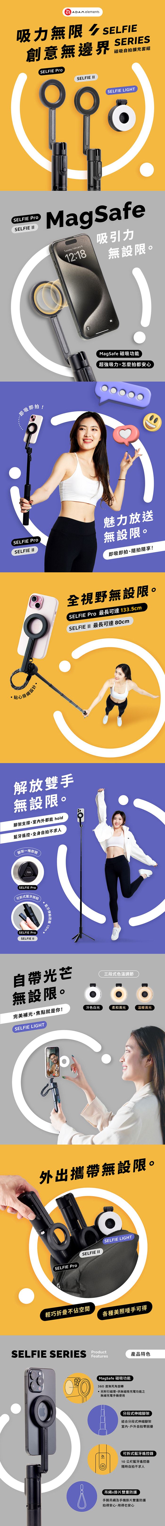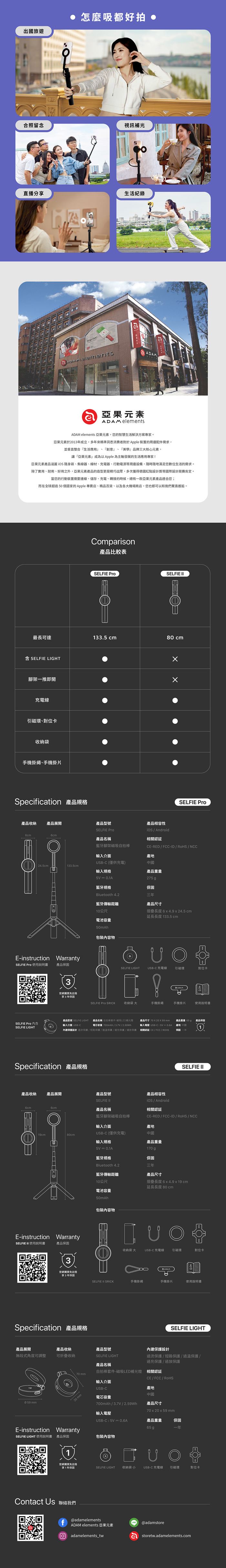 | 內容物 | 自拍棒、USB-C充電線、引磁環、對位卡、收納袋、手機掛繩、手機掛片、使用說明書 |