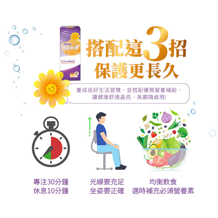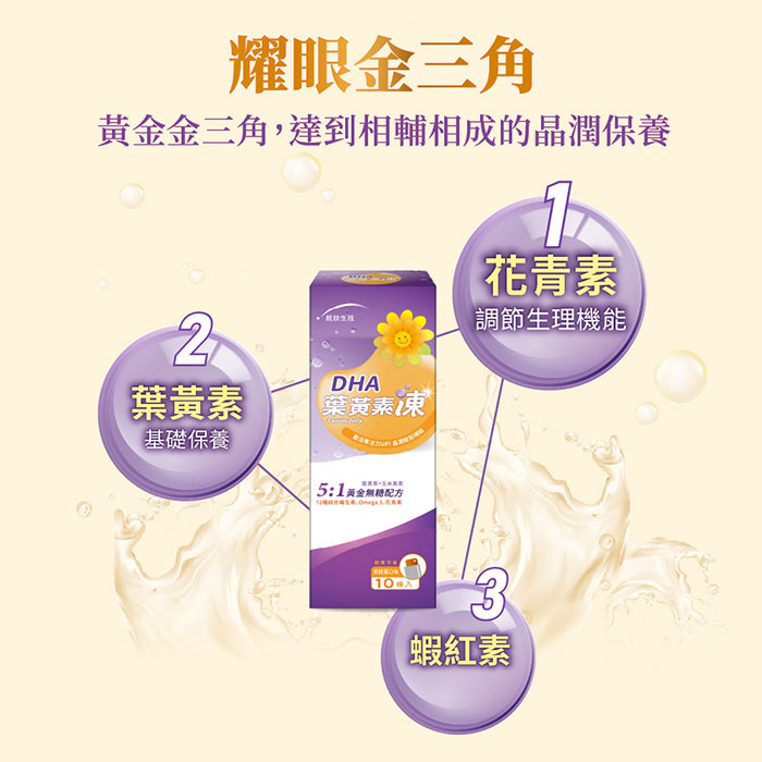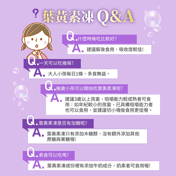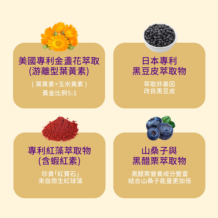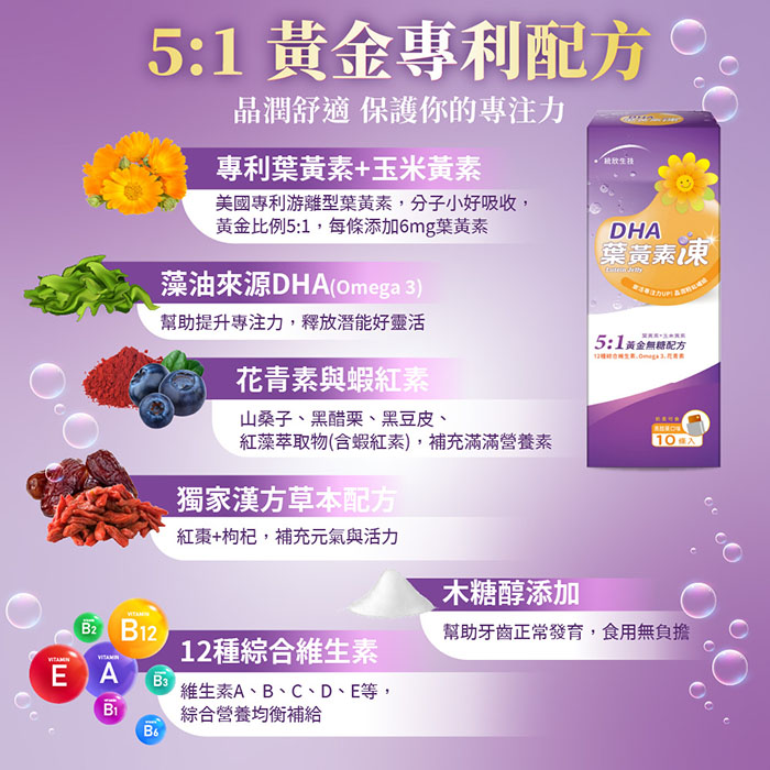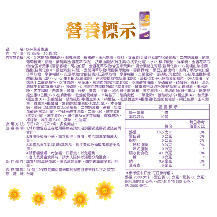 | 內容物 (完整成份/食品添加物) | 水、D-木糖醇(甜味劑)、刺槐豆膠、檸檬酸、玉米糖膠、香料、葉黃素(金盞花萃取物)(辛烯基丁二酸鈉澱粉、乾燥葡萄糖漿、蔗糖、葉黃素(金盞花萃取物)、抗壞血酸鈉(維生素 C)(抗氧化劑)、水)、檸檬酸鈉、洋菜粉、金盞花萃取物(含玉米黃素)(麥芽寡糖、阿拉伯膠、金盞花萃取物(含玉米黃素)、混合濃縮生育醇(抗氧化劑)、L-抗壞血酸棕櫚酸酯(抗氧化劑))、蔗糖素(甜味劑)、黑醋栗萃取物(黑醋栗萃取物、麥芽糊精)、黑豆皮抽出物、山桑子萃取物(山桑子萃取物、麥芽糊精)、紅藻萃取(含蝦紅素)(紅藻萃取物、麥芽糊精、二氧化矽、卵磷脂(乳化劑)、L-抗壞血酸棕櫚酸酯(抗氧化劑)、dl-α-生育酚(抗氧化劑)、迷迭香提取物(抗氧化劑))、藻粉(含 DHA)(乾燥葡萄糖漿、DHA 藻油、辛烯基丁二酸鈉澱粉、D-甘露醇、葵花油、抗壞血酸鈉(抗氧化劑)、脂肪酸甘油酯、多磷酸鈉、磷酸鈣、香料、混合濃縮生育醇(抗氧化劑)、卵磷脂、L-抗壞血酸棕櫚酸酯(抗氧化劑))、紅棗枸杞萃取粉(微結晶狀α-纖維素、玉米澱粉、麥芽糊精、西洋參、紅棗、枸杞、黃耆、甘草)、綜合維生素(乳糖、麥芽糊精、L-抗壞血酸(維生素 C)、乾燥型維生素 E (乙酸 dl-α-生育醇酯、乾燥葡萄糖漿、辛烯基丁二酸鈉澱粉、二氧化矽)、鹽酸吡哆辛(維生素 B6)、核黃素(維生素 B2)、菸鹼醯胺、硝酸硫胺明(維生素 B1,硝酸噻胺)、乾燥維生素 A 醋酸鹽(乾燥葡萄糖漿、阿拉伯膠、玉米澱粉、維生素 A 醋酸鹽、生育醇(維生素 E)(抗氧化劑))、本多酸鈣、膽鈣化醇/維生素D3(辛烯基丁二酸鈉澱粉、蔗糖、抗壞血酸鈉(抗氧化劑)、中鏈三酸甘油酯、二氧化矽、維生素 E(抗氧化劑)、維生素 D3)、維生素B12(麥芽糊精、檸檬酸鈉、檸檬酸、維生素 B12)、葉酸、生物素) |
