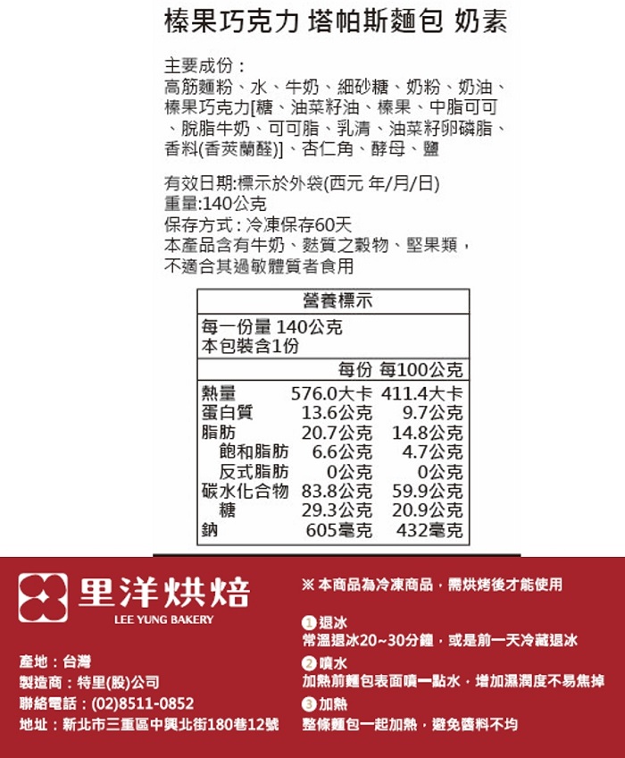 | 商品名稱 | 【里洋烘焙】榛果巧克力塔帕斯麵包20入(140g/入) |