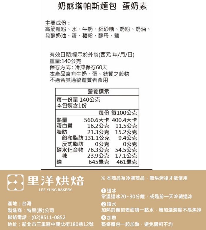 | 商品名稱 | 【里洋烘焙】奶酥塔帕斯麵包20入(140g/入) |