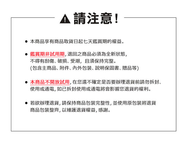 | 一經拆封使用過後,若非產品本身瑕疵,恕無法辦理退換貨 |