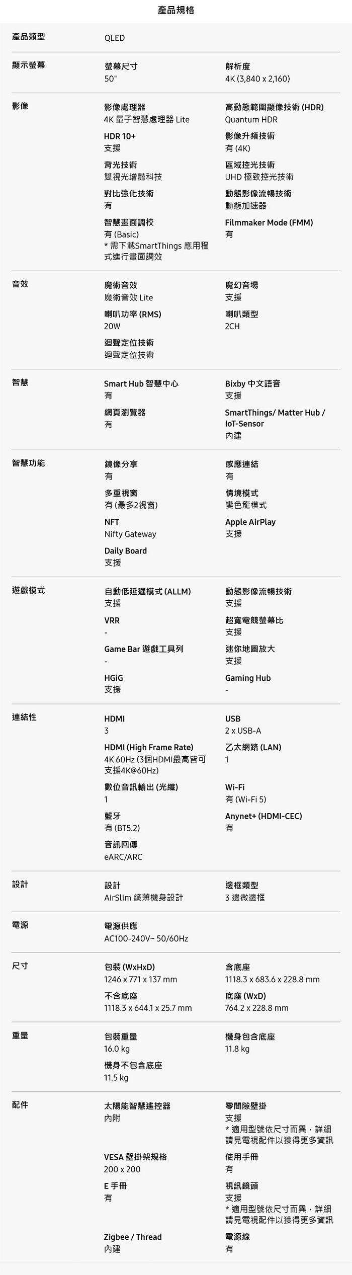 | 商品名稱 | Samsung 三星 50型 QLED 4K QE1D 智慧顯示器QA50QE1DAXXZW |