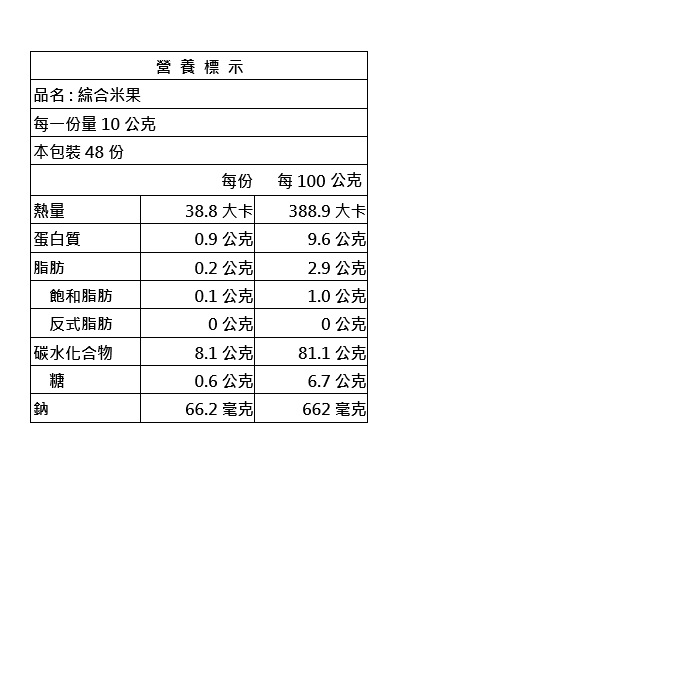 | 過敏原資訊 | 本產品含有花生、大豆、魚類、麩質的穀物及其製品,生產線也生產堅果類製品 |