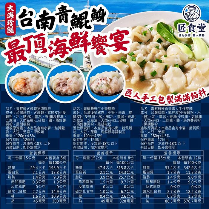 | 商品名稱 | [台南青鯤鯓]匠食堂野生小管餛飩15g*8入/盒*24盒/箱 | |
