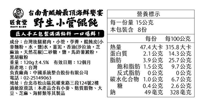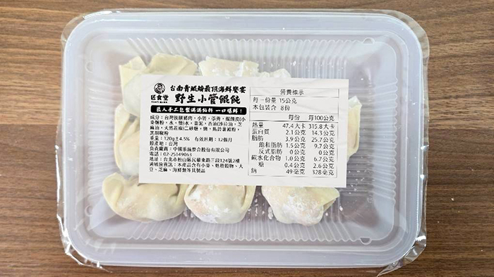 | 內容物(完整成份/食品添加物) | 台灣後腿豬肉、小管、荸薺、餛飩皮(小麥麵粉、水、鹽)、水、薑泥、香油(沙拉油、芝麻油、天然花椒)、二砂糖、鹽、馬鈴薯澱粉、黑胡椒粉 | |