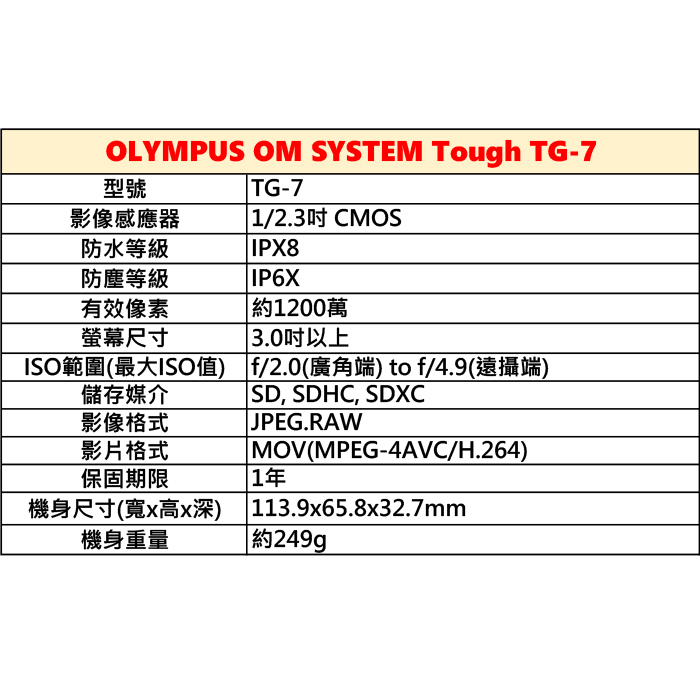 | 【商品名稱或型號】 | 【OLYMPUS】Tough TG-7 防水數位相機-黑色 [加贈2好禮][平輸] |