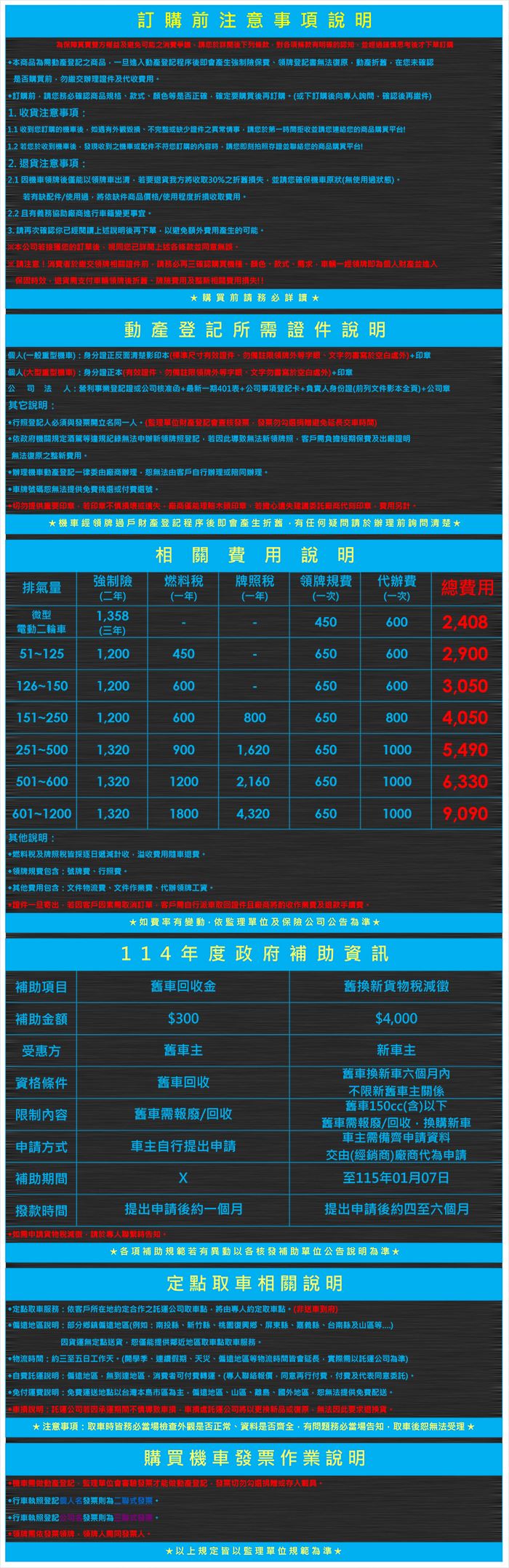 3.若因申辦人因素導致無法辦理領牌登記,所導致之機車折舊、代辦工資、短期保費、人事開銷費用,皆須由申辦人負擔。