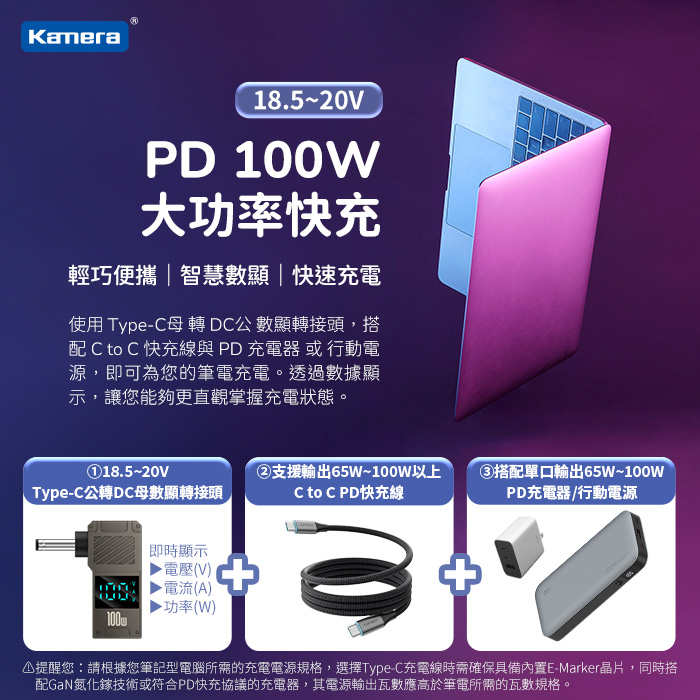 - 搭配Type-C公對公傳輸線(可耐5A電流)電源線及PD 18.5~20V充電器或行動電源使用。