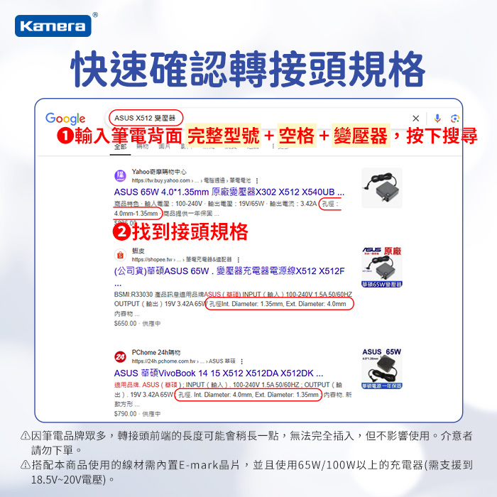 Google搜尋輸入「筆電背面完整型號+空格+變壓器」,按下搜尋