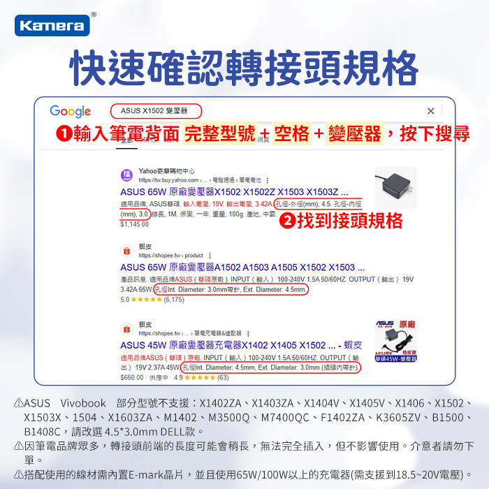 ❶ Google搜尋輸入「筆電背面完整型號+空格+變壓器」,按下搜尋