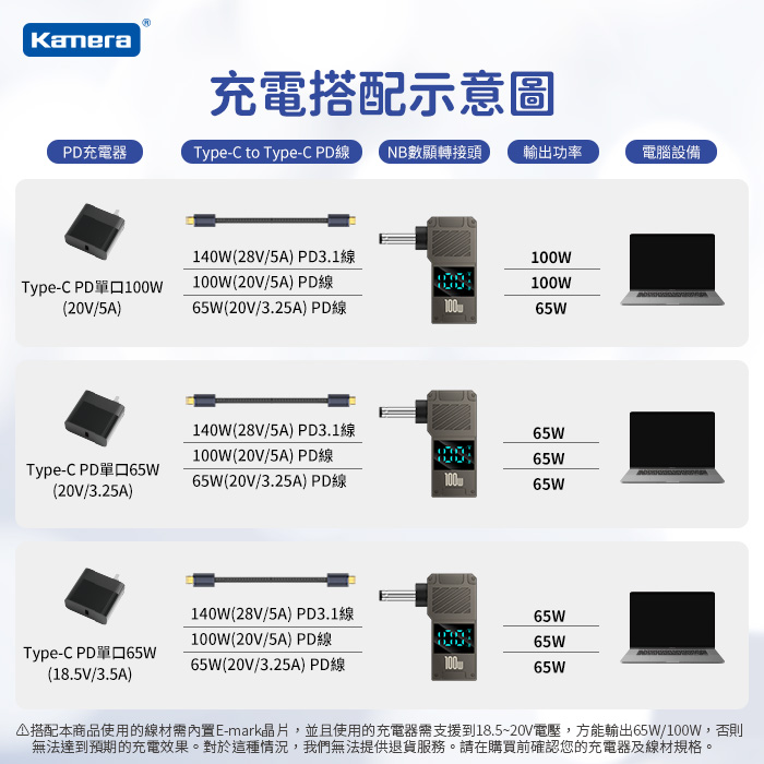 - 搭配Type-C公對公傳輸線(可耐5A電流)電源線及PD 18.5~20V充電器或行動電源使用。