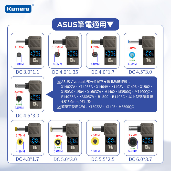 ※ASUS Vivobook系列因規格較為複雜,購買前請先實際測量確認充電孔尺寸,外徑尺寸符合但內針不一定吻合。