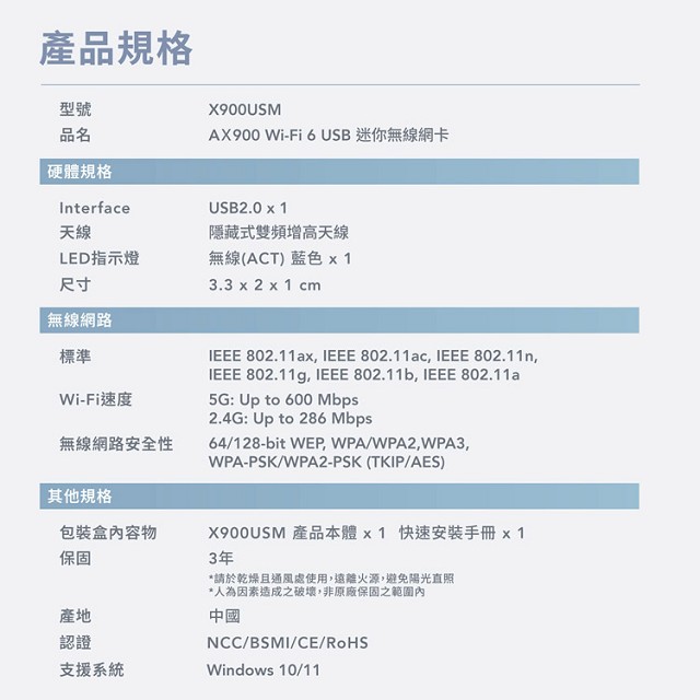 | 【內容物】 | X900USM無線網卡 x 1 |