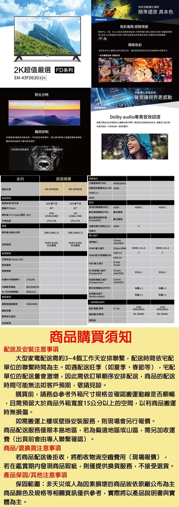 | 商品名稱 | SAMPO聲寶 43"FHD杜比音效液晶顯示器/無視訊盒 EM-43FD630 |