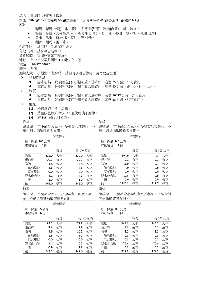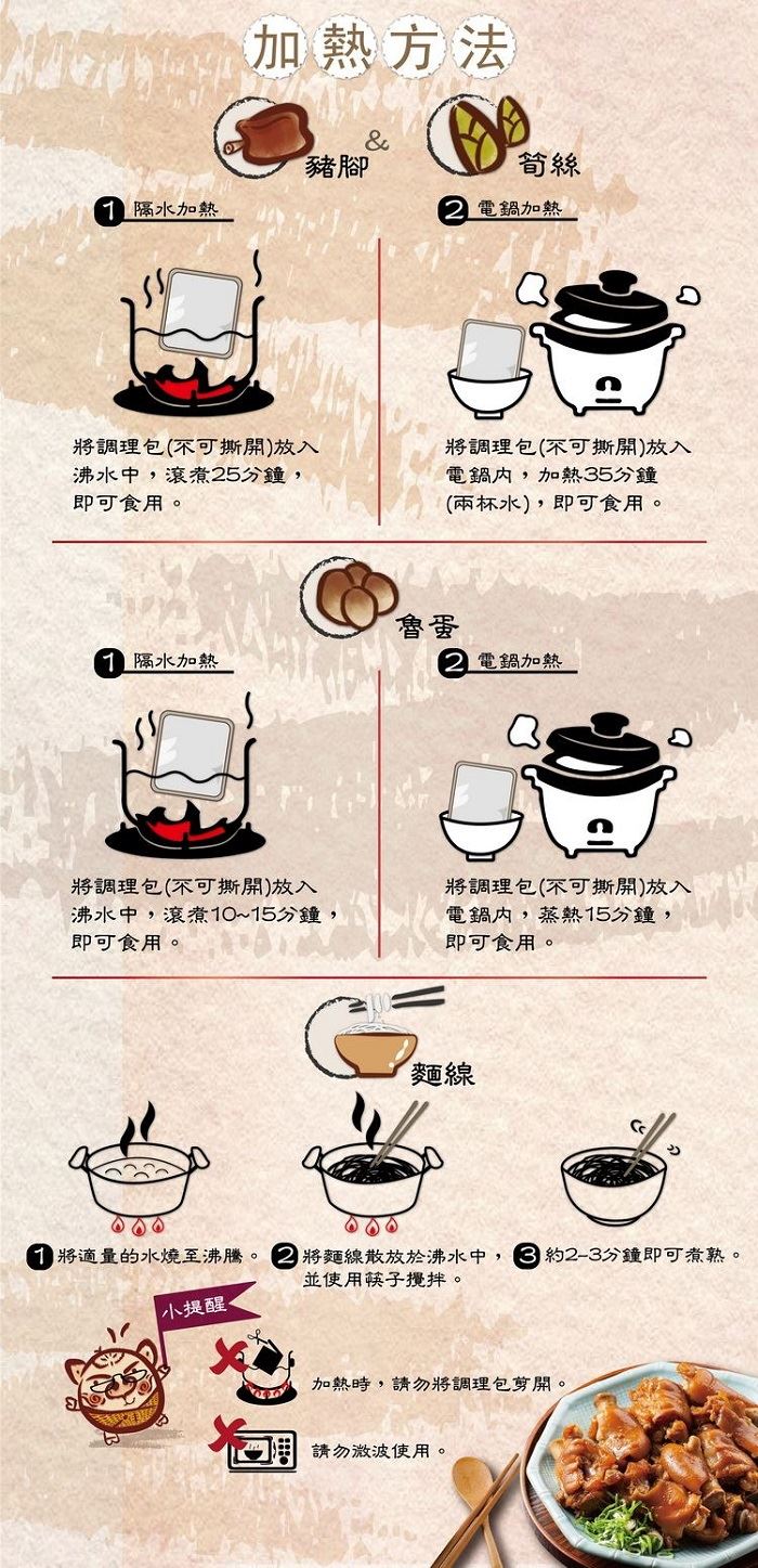 | 包裝內容/商品規格 | 每盒含豬腳500g+筍絲440g+魯蛋330g+麵線600g,本規格共6盒 |