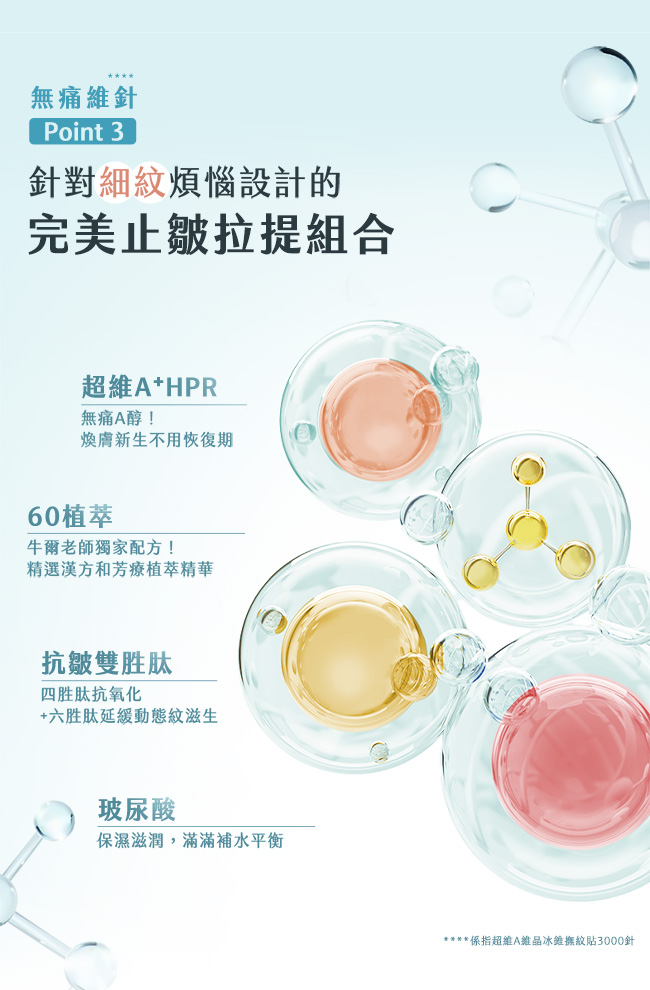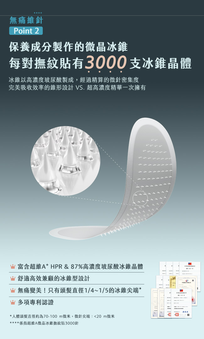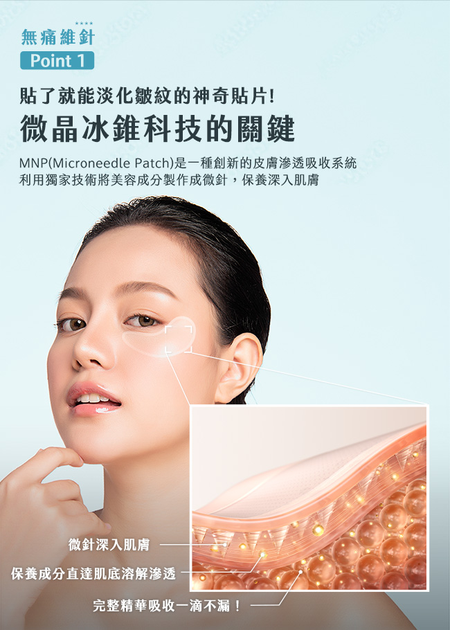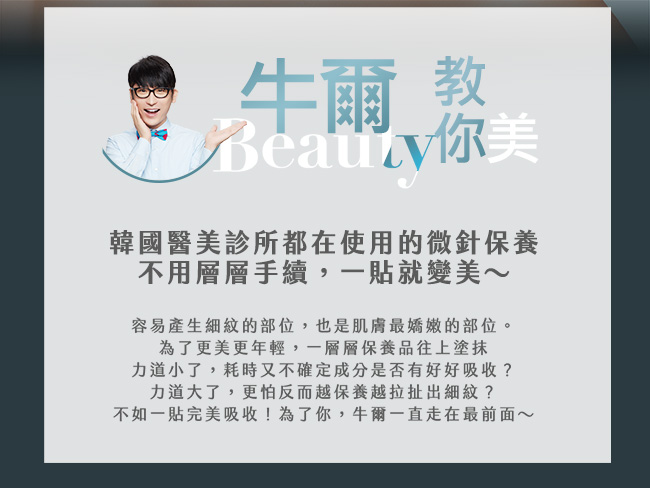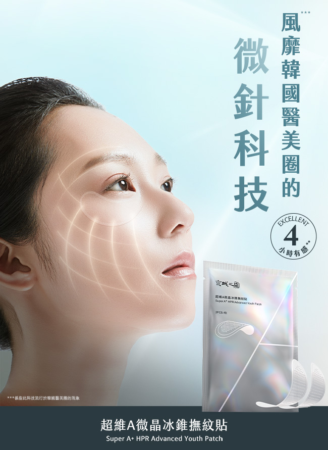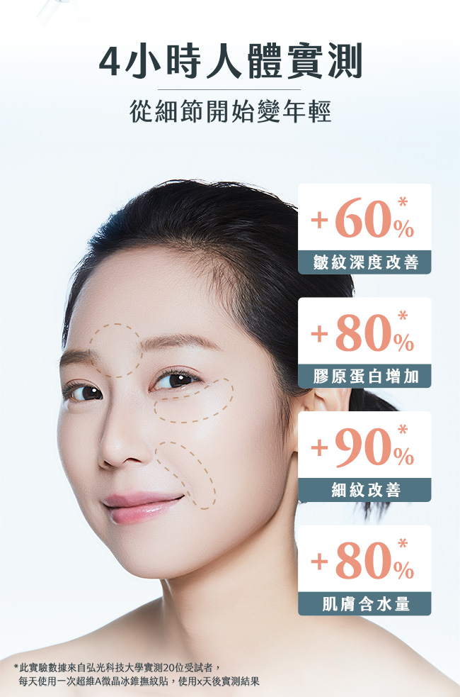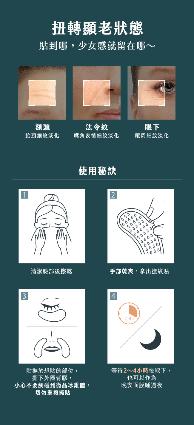 | 使用方法 | 1.清潔肌膚後,擦拭肌膚維持乾爽。 2.請保持手部乾爽,打開泡殼後從凹陷處取出貼片,請從貼片背面箭頭鋼印處撕下外圈膠紙,注意不要觸摸貼片上微細凸起部位。 3.將貼片內側微細凸起部位貼敷於肌膚上在意的細紋處。例如眼周或法令紋等部位。 4.以指腹輕輕按壓貼合肌膚,建議使用2~4小時後即可取下,也可以貼敷過夜。 |