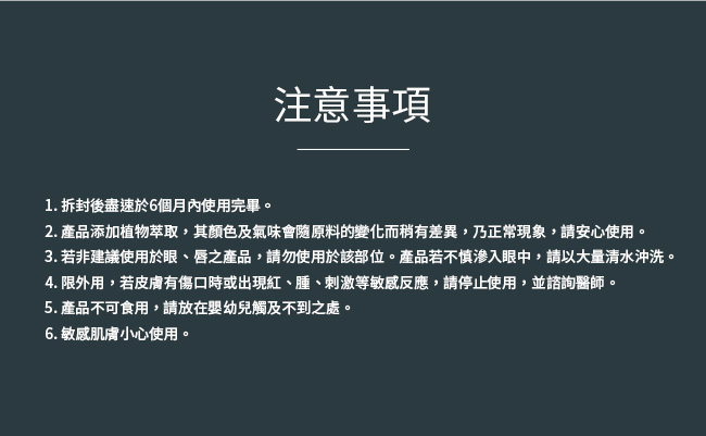 | 注意事項 | 1. 僅限外用,請放置於兒童不易取得處,如有不適請停止使用,皮膚敏感者請詢問專科醫師。 2. 本產品不提供試用,7天「鑑賞期」非「試用期」,欲辦理退貨之商品必須是全新完整、未拆封之包裝狀態(含商品本體、贈品、原包裝袋、盒、箱、隨貨文件)。除非是商品瑕疵問題,拆封後無法辦理退貨。 3. 拆封後請儘速使用完畢。 4. 產品添加植物萃取,其顏色及氣味會隨原料的變化而稍有差異,乃正常現象,請安心使用。 5. 若非建議使用於眼、唇之產品,請勿使用於該部位。產品若不慎滲入眼中,請以大量清水沖洗。 6. 若皮膚有傷口時或出現紅、腫、刺激等敏感反應,請停止使用,並諮詢醫師。 7. 產品不可食用,請放在嬰幼兒觸及不到之處。 8. 敏感肌膚小心使用。 |