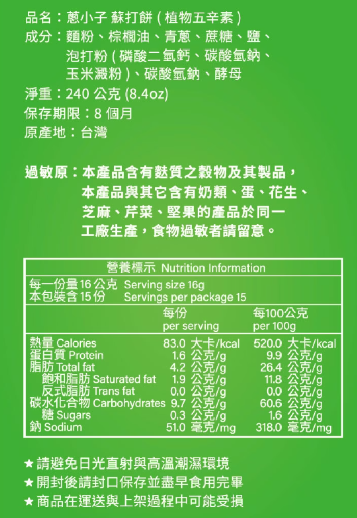 | 內容物(完整成份/食品添加物) | 麵粉、棕櫚油、青蔥、蔗糖、鹽、泡打粉(磷酸二氫鈣、碳酸氫鈉、玉米澱粉)、碳酸氫鈉、酵母 |