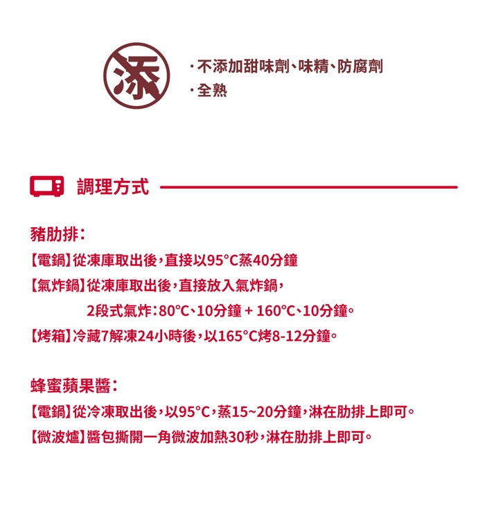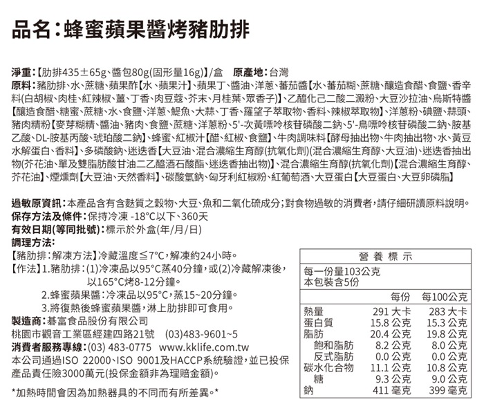 品名:KKLife蜂蜜蘋果醬烤豬肋排 調理方法: |