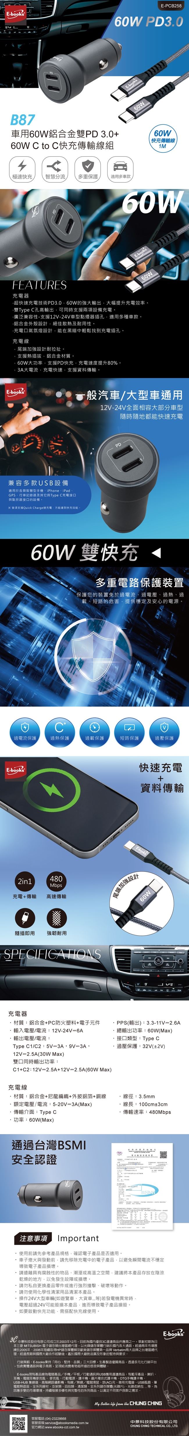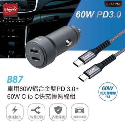| 【商品名稱或型號】 | E-books B87 車用60W鋁合金雙PD 3.0+60W C to C 快充傳輸線組 |