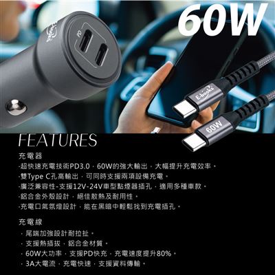 E-books B87 車用60W鋁合金雙PD 3.0+60W C to C 快充傳輸線組