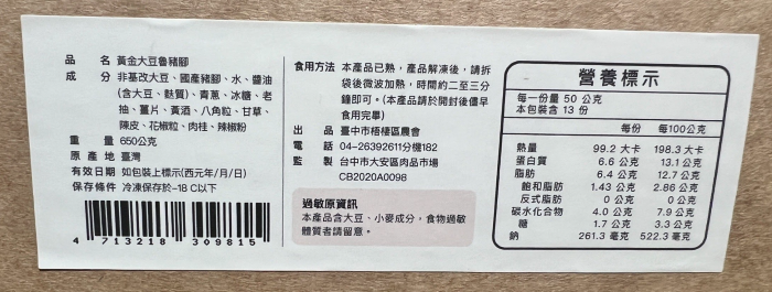 | 內容物(完整成份/食品添加物) | 非基改大豆、國產豬腳、水、醬油(含大豆、麩質)、青蔥、冰糖、老抽、薑片、黃酒、八角粒、甘草、陳皮、花椒粒、肉桂、辣椒粉 |