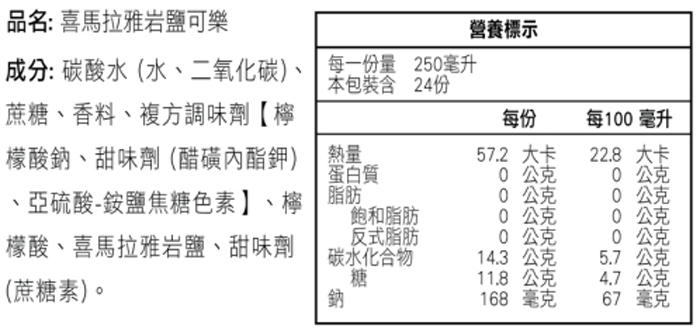 | 商品名稱 | 喜馬拉雅岩鹽可樂250ml(24入) |