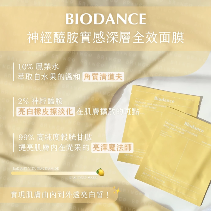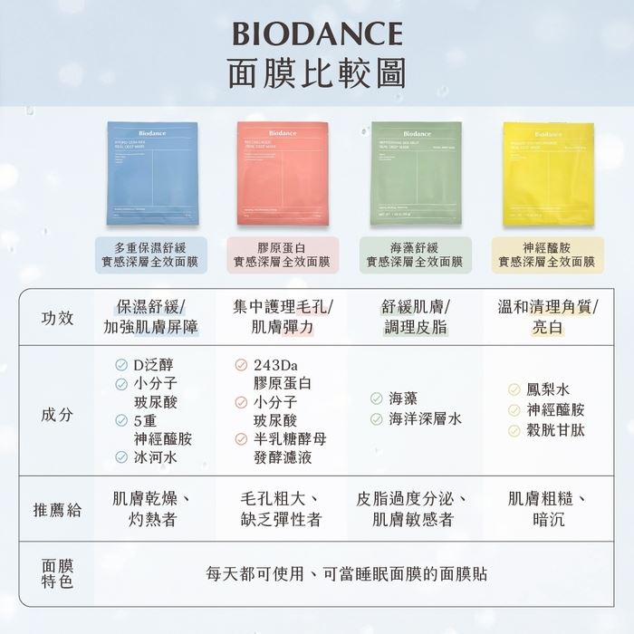 | 商品名稱/包裝內容規格 | Biodance 全效凝膠面膜四片/盒(粉色/黃色/綠色/藍色) |