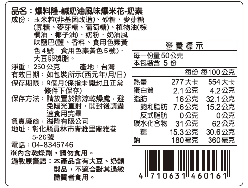 | 內容物(完整成份/食品添加物) | 玉米粒(非基因改造)、砂糖、麥芽糖(寡糖、芽糖、葡萄糖)、植物油棕櫚油、椰子油)、奶粉、奶油風味鹽巴(鹽、香料、食用色素黃 營養標示色4號 、食用色素黃色5號)、大豆卵磷脂。 |